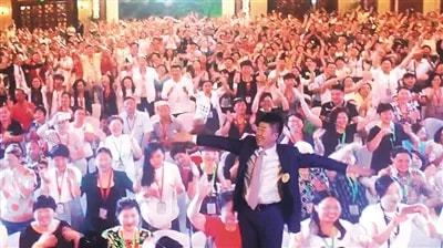 ▲2018年6月初,創造豐盛北京盛典現場,主持人帶領大家歡呼“讓宇宙聽到我們”。當天有來自全國各地的近千人蔘加此盛典,現場5台POS機同時開工刷卡,報名費人均5萬起。圖源新京報。