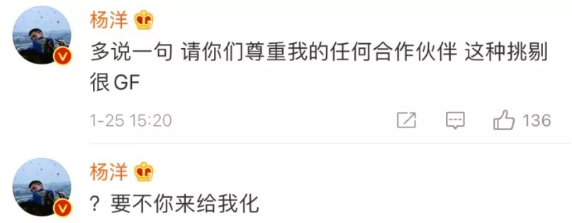 楊洋脾氣上來也懟了不少粉絲,請尊重合作伙伴。