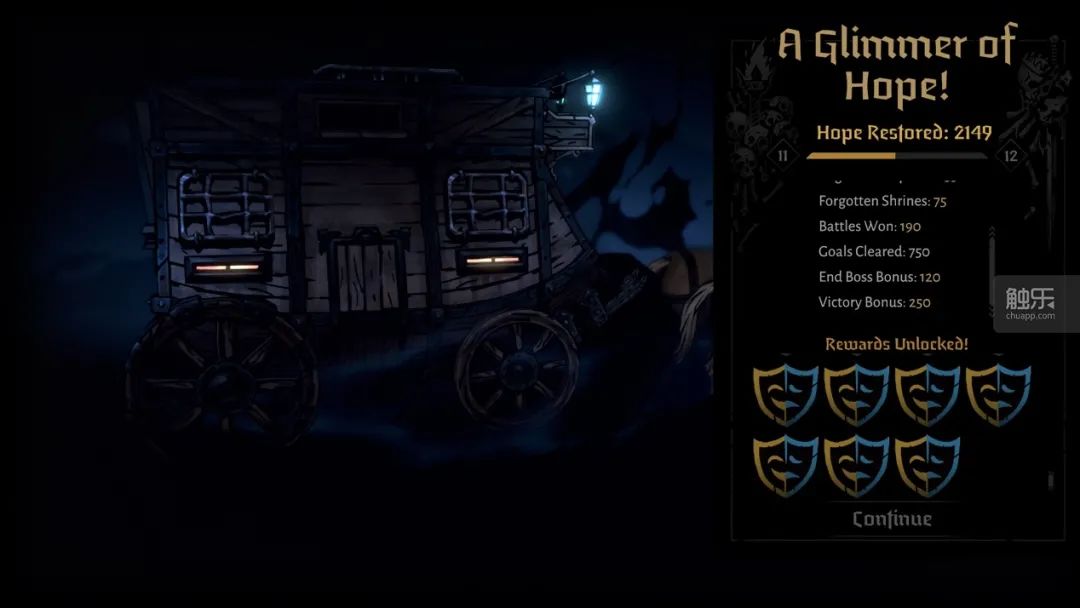順利通關之後,玩家依然會回到最初的起點。畢竟這是一款Roguelike遊戲,循環和輪迴與生俱來。區別是,在失敗的征程中會毀壞的馬車此時依然完好,而我重拾的希望值之多前所未有,一下子將存檔升到了11級,解鎖了我在前作中最喜歡的小丑。我已經等不及帶着他開始下一輪征程了。遺憾的是,前作同樣屬於元老級人物的十字軍和修女不見蹤影,但願只是先行體驗版尚不完整的原因。