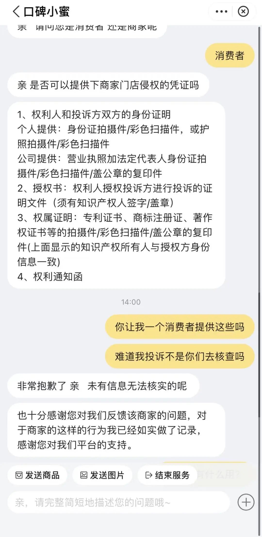 “我是一個消費者,到哪裏找這些證明?難道不是平台負責核實嗎?”面對記者的質疑,口碑客服稱,“對不起,沒有信息無法核實。”