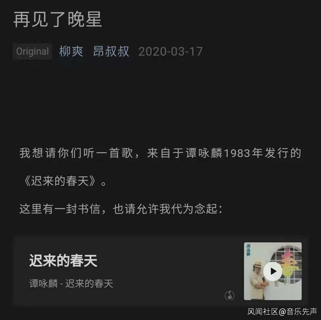 歌曲走紅後,柳爽此前以張德全老人的口吻寫給“妻子”康氏的信《再見了晚星》也被翻了出來,不少人被“晚星痴迷四下無人的夜宇,不肯傾訴光顧星球的原因”的細膩筆觸所打動。