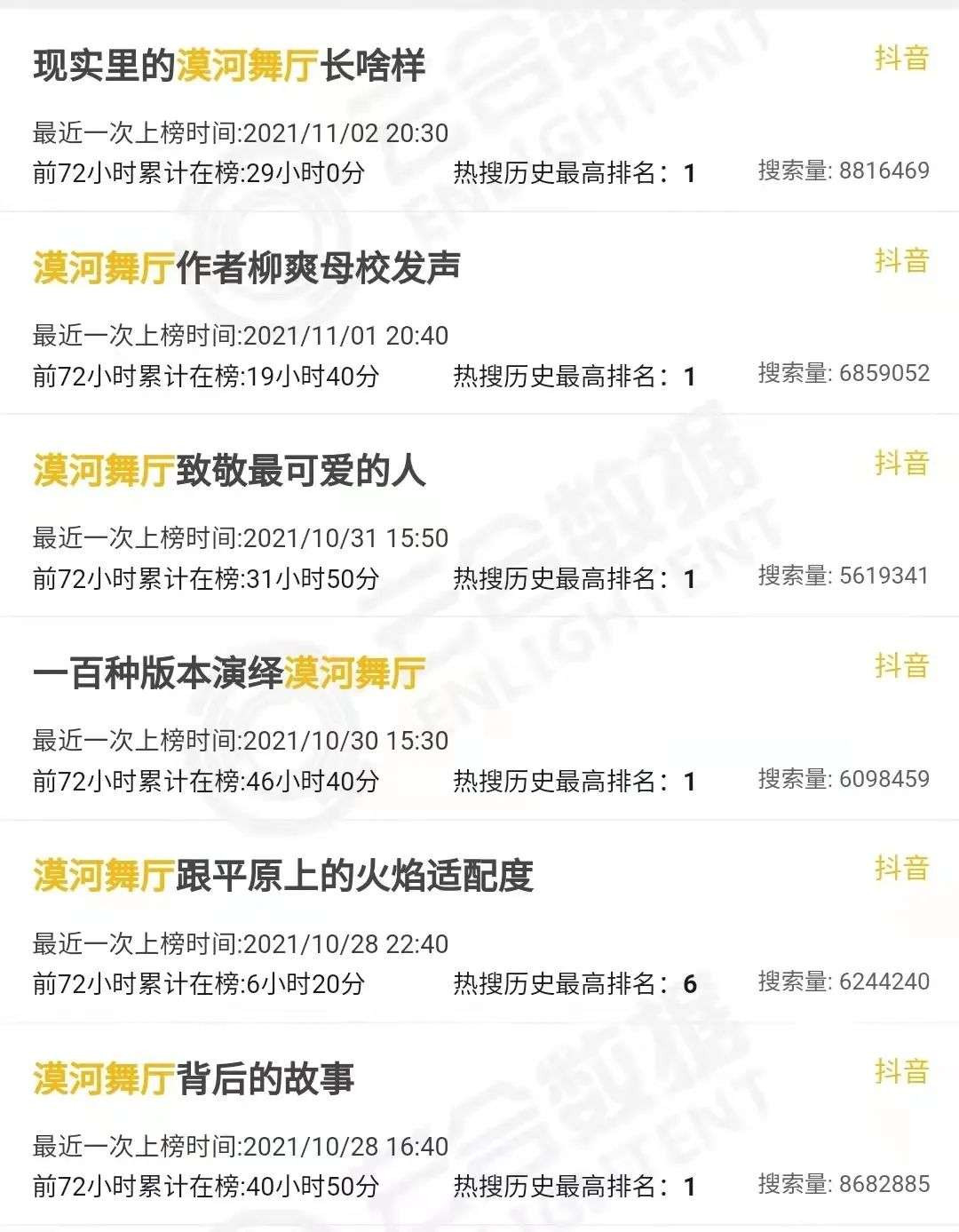 10月27日,《漠河舞廳》登上微博熱搜;與此同時,“廖凡跳舞BGM”也登上了抖音熱榜。此後幾天內,《漠河舞廳》的熱度持續走高,自10月28日至今,相關話題已5次登上抖音熱榜TOP1。