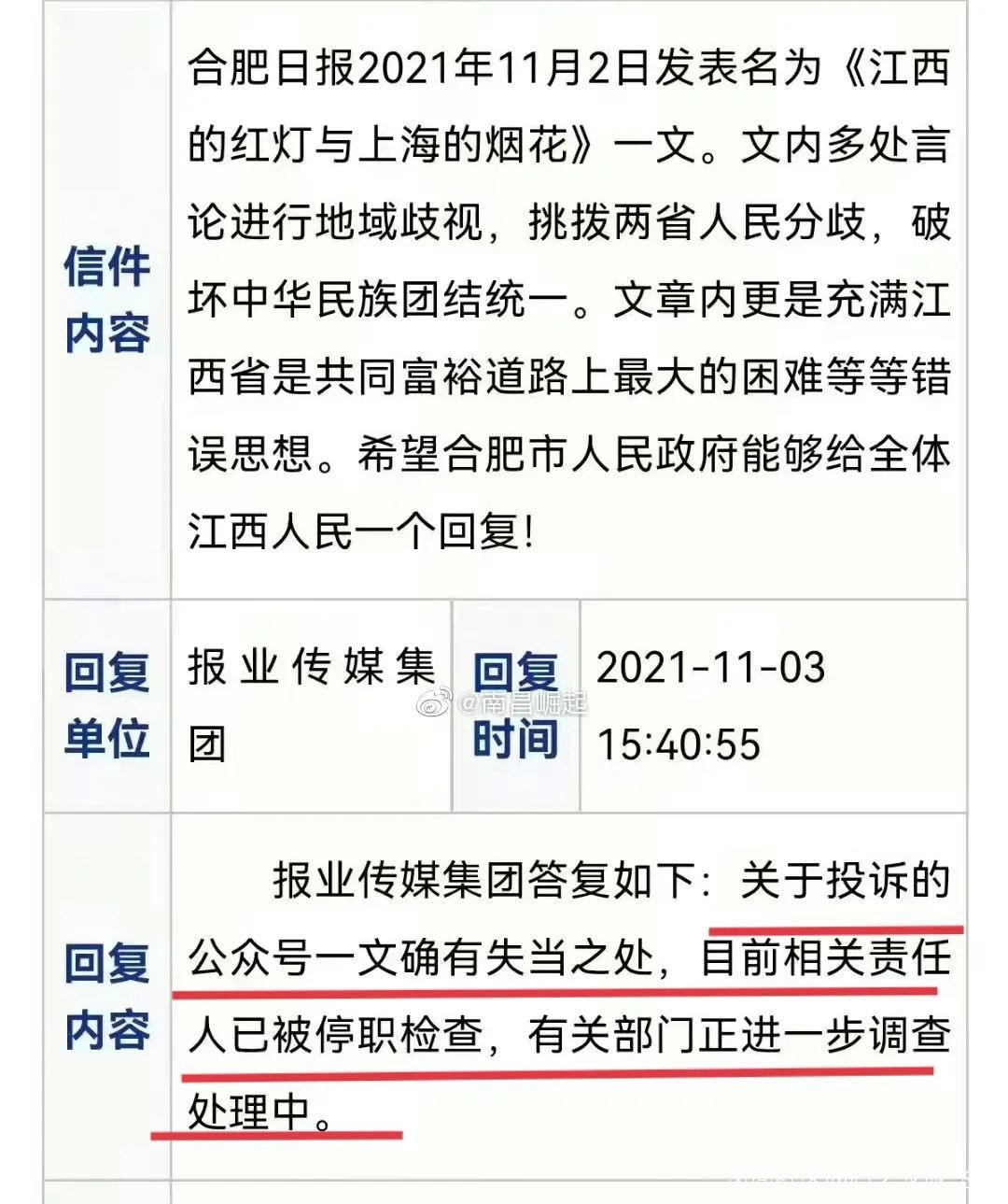 合肥報業回應《江西的紅燈與上海的煙花》:責任人停職檢查_風聞