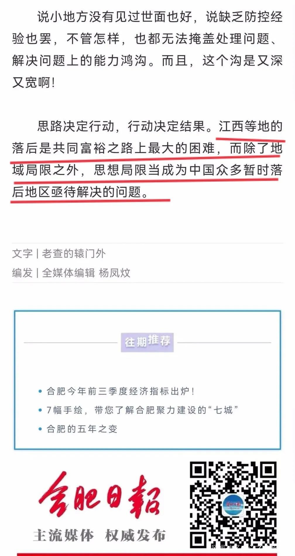 沒想到的是,一個省會的黨報,居然以一種市井癟三的口吻,語含嘲諷,一邊無腦地讚美上海,一邊醜陋地侮辱江西。這的確是令人驚詫,無怪乎江西人羣起憤怒,要逼合肥日報道歉了。