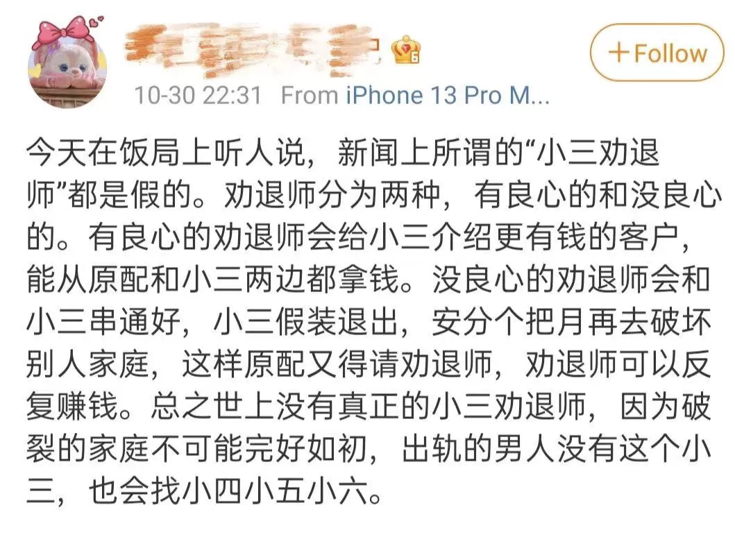 很多時候,小三勸退師之所以擁有源源不斷的客户,是因為回頭客太多。