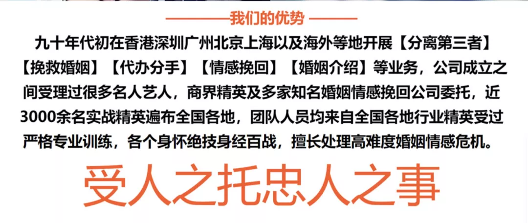 在百度搜索小三勸退,首頁會跳出一連串公司信息,號稱可以幫助你擊退小三,挽回愛情。廣告文案也寫得頗有江湖氣:受人之託,忠人之事。