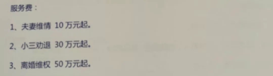 協議費用均為提供服務前一次性收取。有公司貼出他們的收費標準:勸退小三每單30萬起。
