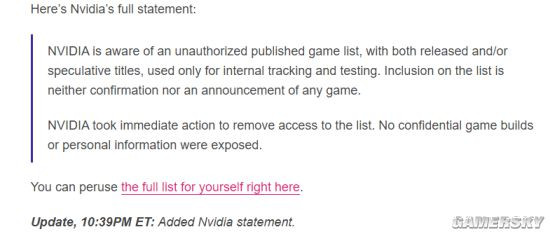 不過,英偉達官方發公告稱,他們注意到了有一份未經授權的遊戲名單被泄露,其中包括很多已發售的遊戲,但這份名單僅用於內部測試,名單上的日期並不具備真實性。