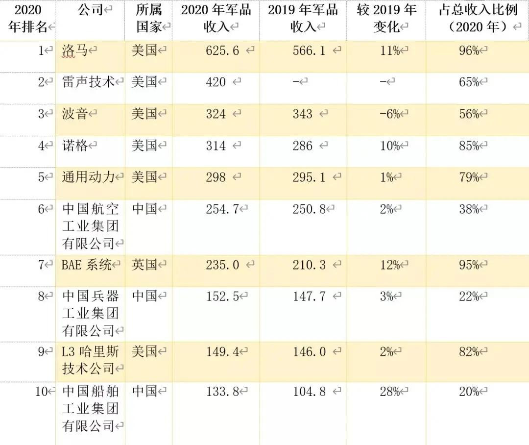 2020年世界軍工百強企業排行榜,美國上榜企業達50家_風聞