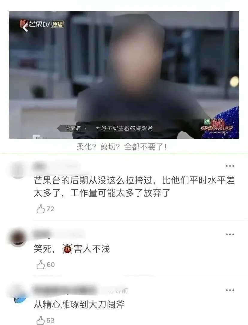 而那些已經蓋在屏幕上的馬賽克,在觀眾每次點開節目時反覆播放。借剪輯師口中常提的“故事結構”來説,它們更像在訴説着,綜藝節目另外一段“欲蓋彌彰”的事情。