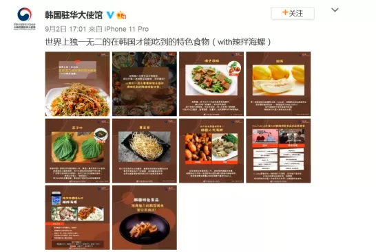 他們發了條微博説這些食物只有在韓國才能吃到。
