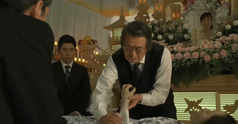 你能從社長的嚴肅的眼神,温柔的手勢,感受到他對亡者的尊重。