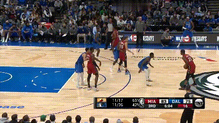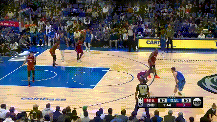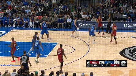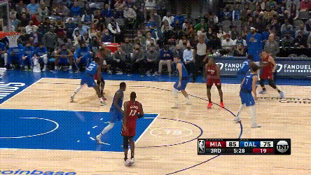 **第二個問題,點名鄧羅、希羅,要如何解決熱火的協防?**沒有找終結者出來掩護時,熱巴必然留在籃下,東契奇點名弱點,選擇突破還是可能面對熱巴協防。這種情況,東契奇也不是沒有辦法,他以前打爵士,躲戈貝爾有同款方案——讓對位者成為屏障,不讓協防球員干擾自己,這樣殺到籃下後,隔着對位球員終結就行了。