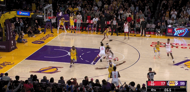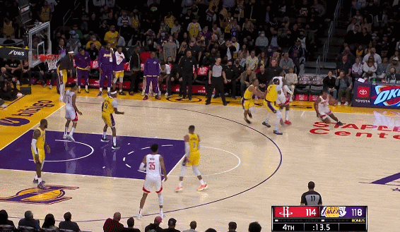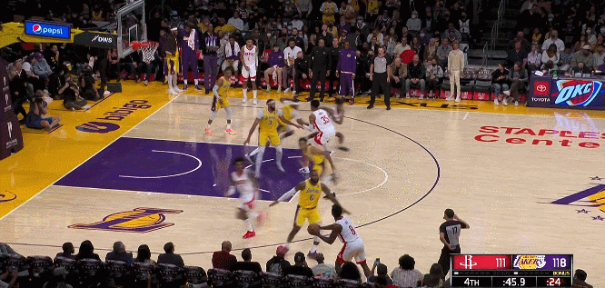 比賽最後2分鐘,火箭落後10分,在湖人的無限換防之下,火箭的年輕人們找不到出手機會,看上去也不太敢出手了。