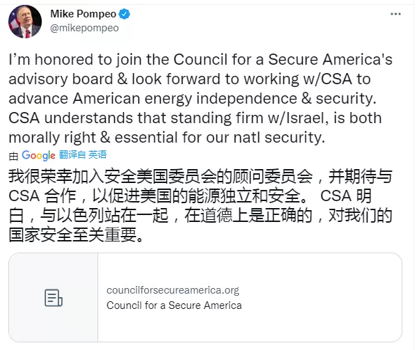 日前,蓬佩奧還宣佈他將加入安全美國委員會(The Council for a Secure America),這個號稱以保障美國能源安全為宗旨的智庫,其核心是捍衞《亞伯拉罕協議》的理念和加強與以色列的戰略聯盟。