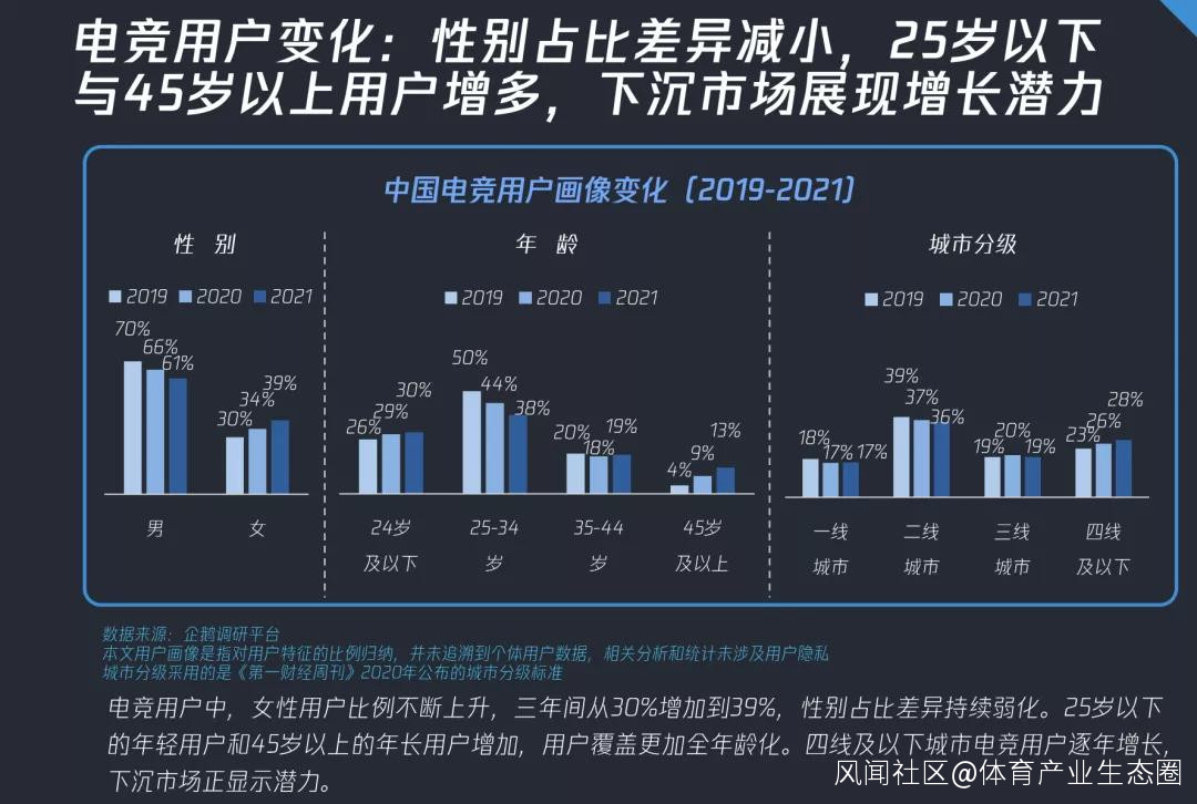 而這些素質要求也決定了電競的受眾人羣以年輕人為主。根據《2021年中國電競運動行業發展報告》,在中國,電競用户在25歲以下佔比30%,34歲以下佔比則高達68.2%。在全球,2021年全球電競觀眾將增長至4.74億,核心電競愛好者佔據2.34億。