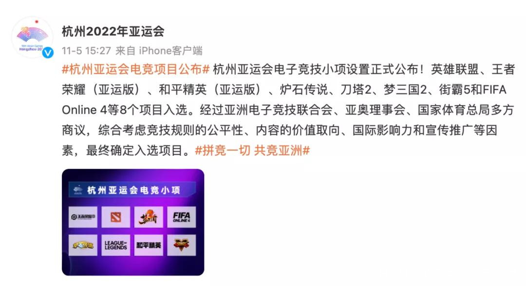 11月5日,杭州亞組委在第四屆中國國際進口博覽會上對外公佈了第19屆亞洲運動會(簡稱亞運會)項目所有小項,其中電競項目的八個小項分別是《英雄聯盟》《王者榮耀亞運版本》《和平精英亞運版本》《FIFA Online 4》《爐石傳説》《街霸 5》《夢三國 2》與《DOTA 2》,這八個項目涉及騰訊、拳頭遊戲、EA SPORTS、暴雪娛樂、CAPCOM、電魂網絡和Valve等多家廠商。