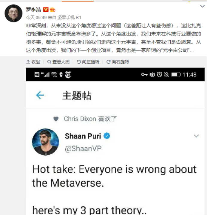 11月5日清晨,羅永浩發微博:下一個創業項目是一家“元宇宙公司”!並配有Shaan Puri在社交媒體發文的長圖。