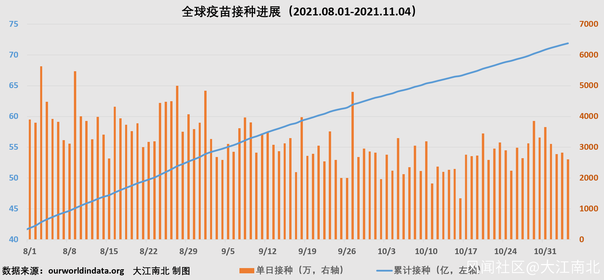 截止2021年11月4日,全球累計接種新冠疫苗71.90億劑;其中單日接種2609萬劑;平均每百人接種91.30劑,環比增加0.30劑。