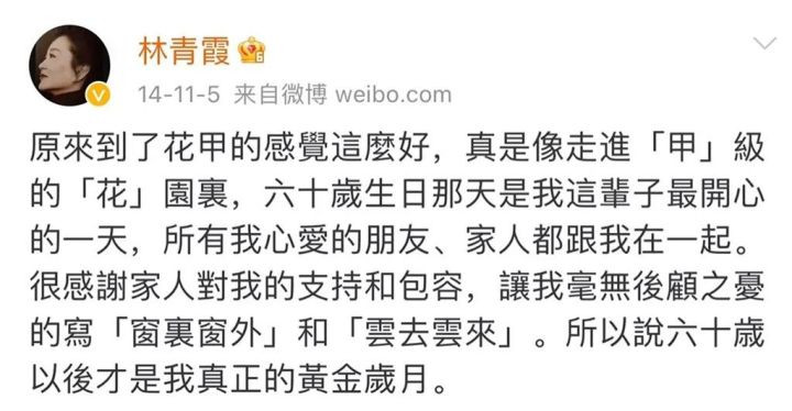 在自己的時間表裏,她們從未把自己當成老人;年紀也不會成為她們做任何事的阻礙。 反觀當代的我們呢,缺少了這一份耐心。 我們總是很急,25歲想要事業有成,有車有房;30歲開始容貌焦慮,變着法地想要變年輕。 掐着表過日子的我們,連吃飯都着急,走路都用跑的。可是既沒追上歲月的腳步,也沒成為最好的自己。回看林青霞2014年發的微博,她説:“60歲以後,才是我真正的黃金歲月。”