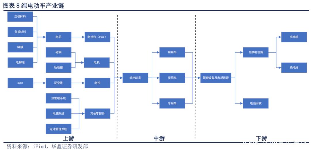 因此純電動車的產業鏈結構較傳統燃油車也更簡單:上游主要由電池組、電機、電控這三大核心部件和其他零部件構成;中游整車與傳統燃油車類似,分為乘用車、商用車和專用車三類,下游配套設施及市場運營主要分為兩個部分,一是充、換電設施,二是電池回收。