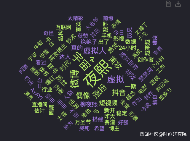 通過時趣洞察引擎對「柳夜熙」的檢索,可以看到柳夜熙是從萬聖節開始發聲才有熱度的,當網友們談到柳夜熙的時候,像「元宇宙」、「AI」、「虛擬」、「美妝」「漲粉」等關鍵詞為主。