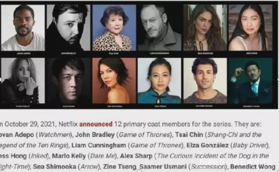 這一天奈飛公佈了首批演員陣容,包括曾出演《奇異博士》《復仇者聯盟3》的本尼迪克特·王,出演《守望者》的約翰·艾德坡,中國觀眾較熟悉的周采芹(美籍),以及多位出演《權力的遊戲》的演員。