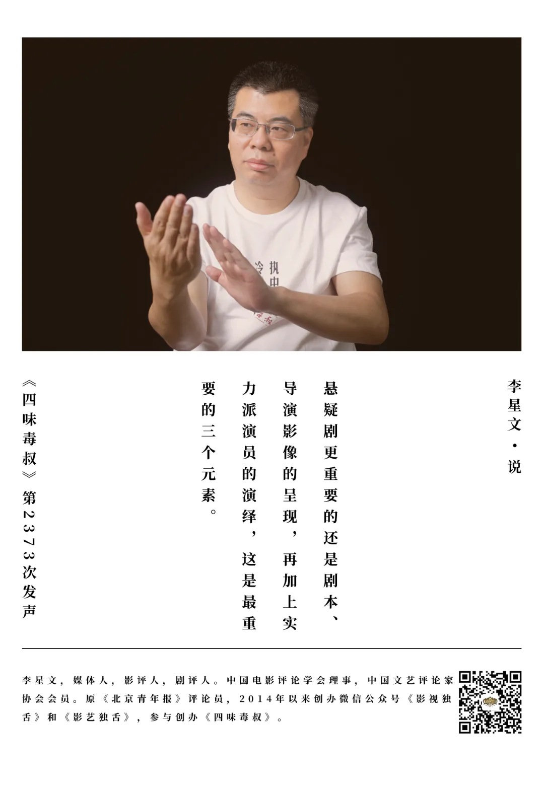 **李星文:**對,所以這個類型更重要的還是劇本、導演影像的呈現,再加上實力派演員的演繹,這是最重要的三個元素。“清朗行動”之後它還是靠這三樣,它不會受太多影響。