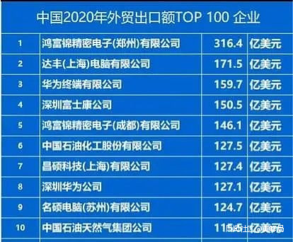 2020年中國出口額百強企業,排名第一的是鄭州富士康,出口總額為316.4億美元,是排名第三華為終端出口總額159.7億美元的幾乎整整一倍。