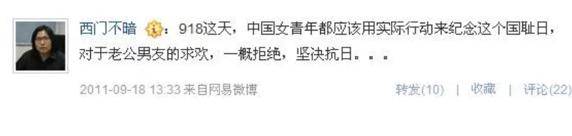 2011年,“南方系”用頭版隆重紀念美國“911事件”10週年。然而幾天後,當中國國恥日918來臨時,南都卻毫無動靜,引發網民強烈譴責。更噁心的是,南都週刊執行主編許慶亮(網名@西門不暗),竟公然調侃國恥,悍然發佈猥瑣言論:“918這天,中國女青年都應該用實際行動來紀念這個國恥日,對於老公男友的求歡,一概拒絕,堅決抗日”。