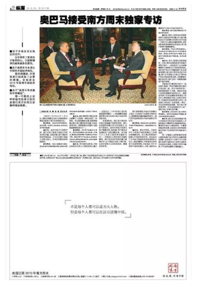 南方系更驕傲的是,他們很受“外國友人”的歡迎,他們説他們是“奧巴馬訪華唯一指定要見的媒體”,這是他們的“榮耀”。
