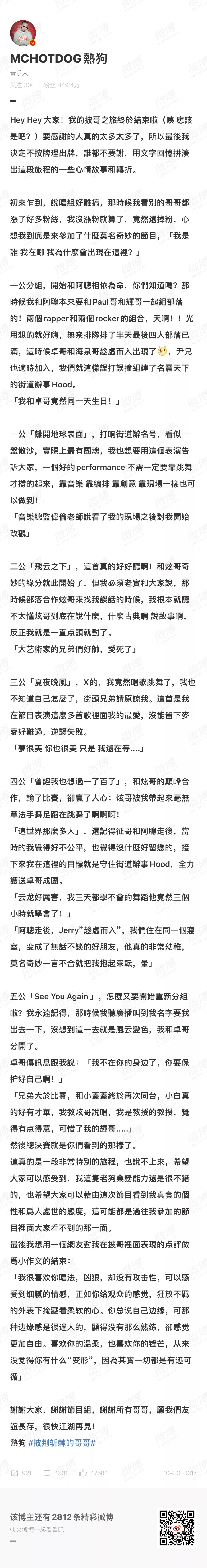 幾天前,熱狗在微博發了篇走心小作文,告別了自己的《披荊斬棘的哥哥》之旅。