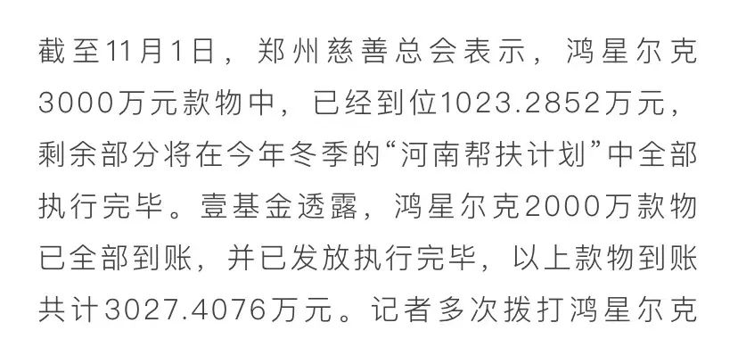 截止11月1日,根據鄭州慈善總會的統計,鴻星爾克簽訂的3000萬元物資捐贈中,已經到位1023.2852萬元,其中有100萬是現金。也就是説,還剩近兩千萬沒有執行,將準備在今年冬季的河南幫扶計劃中執行完畢。