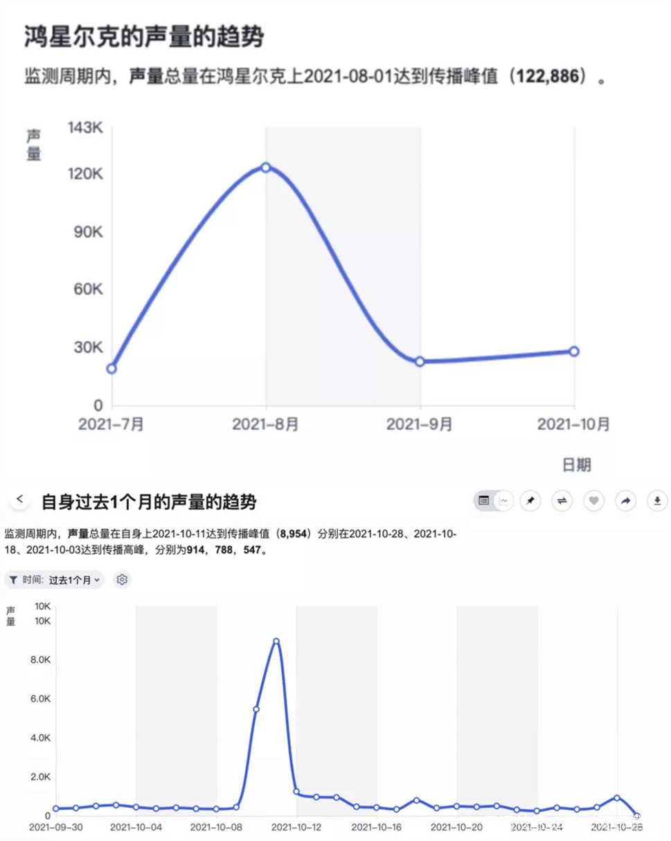 2021年7月~10月,鴻星爾傳播力的頂峯在8月1日,也即7月23日捐款河南事件全網發酵後的數日,在此之後,鴻星爾克的聲量在以肉眼可見的速度鋭降,而10月稍微出現抬升的趨勢,還是因為10月11日這個節點,鴻星爾克又給山西捐了次款。