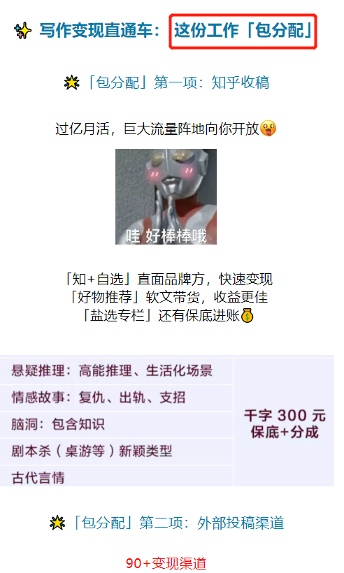 近期,“知乎教育”公眾號還推出“一分錢拼團寫作課”,通過直播課講授寫作變現。據介紹,其最大的亮點是“工作包分配”。從投放的稿件看,知乎表示將開放流量陣地收稿,“知+自選”面向品牌方,“好物推薦”主打軟文帶貨,“鹽選專欄”提供保底進賬。在內部渠道外,知乎還提供90多個外部渠道,保證個性化投稿。