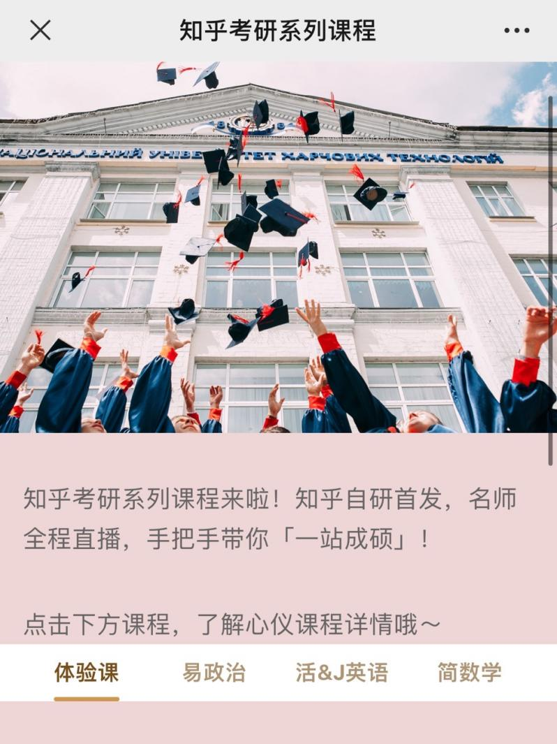 1月底,“知乎教育”公眾號上線,推送內容主要有關考研複習方法、日程提醒等,提供的課程包括體驗課、政治、英語、數學。除了體驗課免費之外,公共課單價均為2299元。