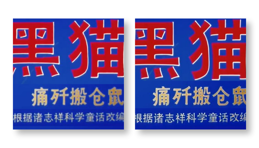上圖是 B 站用户上傳的《黑貓警長》1080p 影片拷貝(ID:BV1XL41137AG),下圖是《黑貓警長》在西瓜視頻的高清修復版。點開兩張圖片並放大後,可以顯而易見的看到,西瓜的修復版,其左側線條及右側文字邊緣異常鋭利清晰,勾線有近似矢量的清晰度,此外也去除了雜色(雖然在原版拷貝里已經處理得不錯了)。