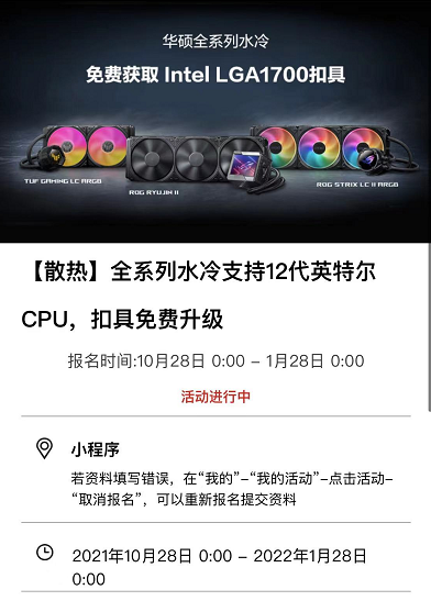哦對了,這次給託尼寄硬件的華碩小哥説,**只要大家購買了華碩的水冷散熱產品,**就可以去官方微信小程序申請免費更換新 CPU 的扣具。