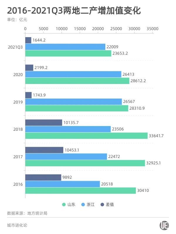 同為製造業大省,工業對經濟增長的支撐性作用顯著,兩地間的差距從工業增加值上也能夠反映出來。前三季度,浙江實現規上工業增加值為14578億元,同期山東為19775.9億元。