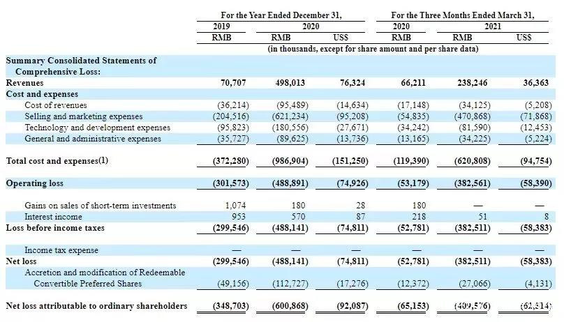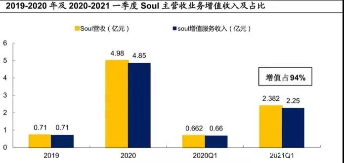 據數據顯示,2019年,Soul錄得淨虧損2.995億元,2020年淨虧損同比擴大至4.881億元;2020年一季度,Soul錄得淨虧損5280萬元,2021年一季度淨虧損同比擴大至3.825億元,淨虧損額分別同比擴大62.67%和624.7%。