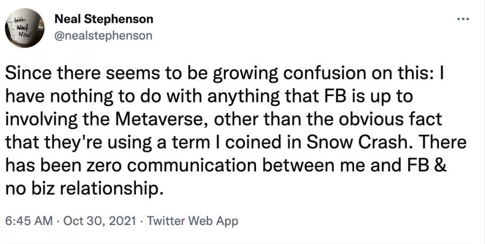 10月30日,在科幻小説《雪崩》中首次提出元宇宙概念的作者Neal Stephenson發推文稱,“我與Facebook涉及元宇宙的任何事情都沒有任何關係,除了一個明顯的事實,即他們使用了我在《雪崩》中創造的術語。我和Facebook之間的交流為0,沒有商業關係。”