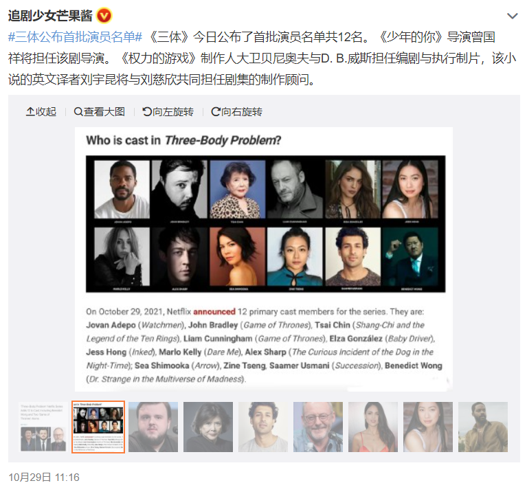 不過,在《三體》項目上,這一點好像又説不準了。起碼從目前公佈的陣容來看,首批演員中有亞裔,卻並無中國市場走出的、中國人熟悉的明星,在劉慈欣之外啓用的中國主創曾國祥在內地也是褒貶不一,不免令人擔憂。
