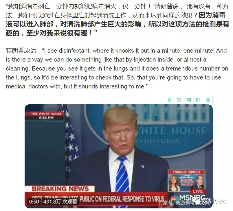 在疫情爆發的初期,白宮政府明顯準備不足,口罩、手套、防護服紛紛告急,在“美國優先”思想作祟下,親自下場攔截盟友及夥伴國的防護物資。“懂王”信口開河,聲稱消毒劑能在一分鐘之內消滅病毒,可以把消毒液輸入肺部,對肺部進行大清洗。筆者心想,這個辦法真是“絕”,只不過是斷子絕孫的“絕!”