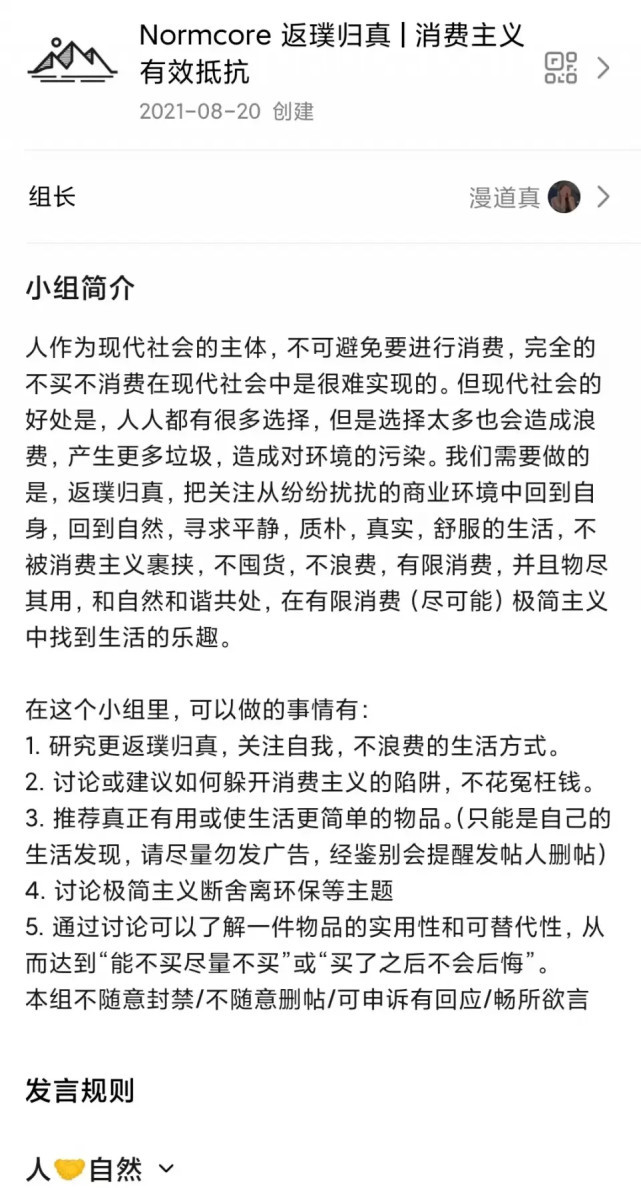 **“消費主義有限抵抗”小組簡介裏寫明瞭這樣一條準則:“不被消費主義裹挾,不囤貨,不浪費,有限消費,和自然和諧共處”。**在這裏,“迴歸真實”“極簡生活”與“斷舍離”成了經驗貼最常出現的關鍵詞,組內豆友Alex(化名)這樣闡述自己對“消費主義”的理解:“用金錢去衡量一切的觀念會割裂人與人之間的關懷,所以我時常會告訴自己要去愛一個個具體的人。”