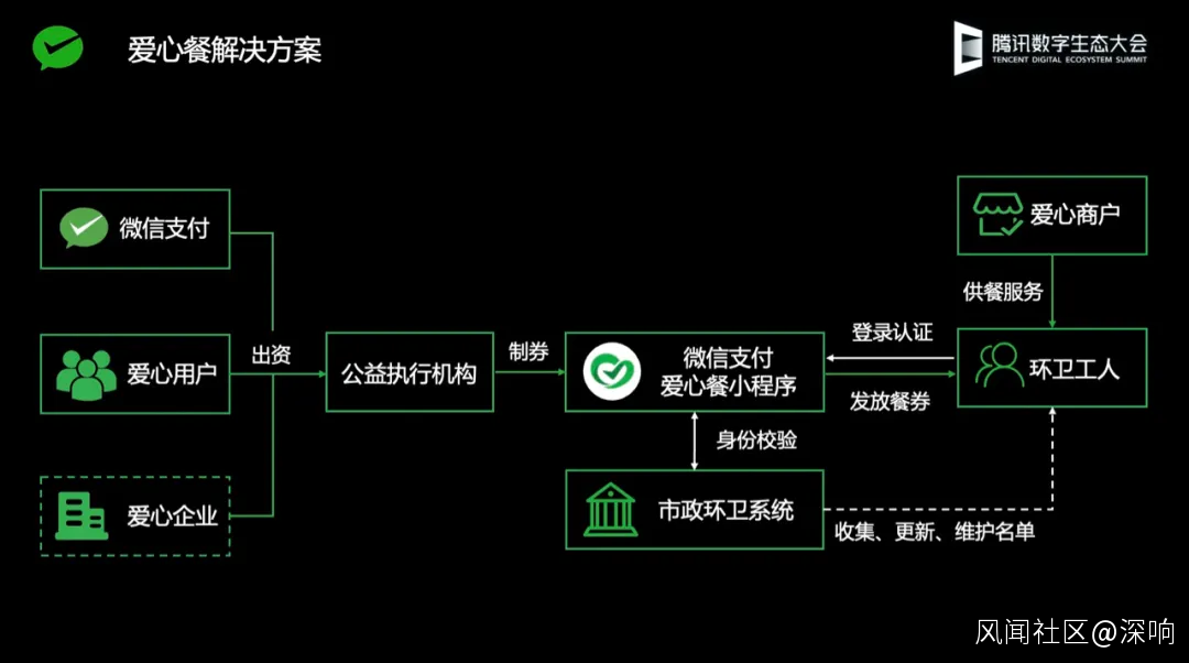 今年10月,微信支付聯合深圳市城市管理和綜合執法局、美麗深圳公益基金會、騰訊公益共同發起“微信支付愛心餐計劃”,與愛心餐飲商家、服務商一起,讓深圳6萬餘名環衞工人每週都能以1分錢的價格在全市近千家餐廳門店享用一頓愛心餐。