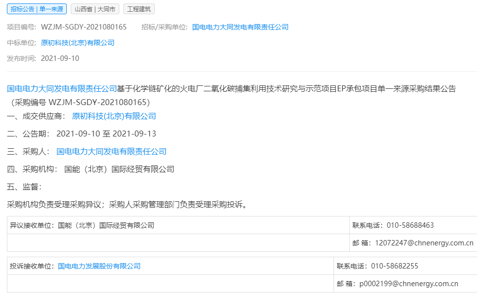 根據國電電力大同發電有限責任公司項目招標公告項目的EP承包項目單一來源為原初科技(北京)有限公司