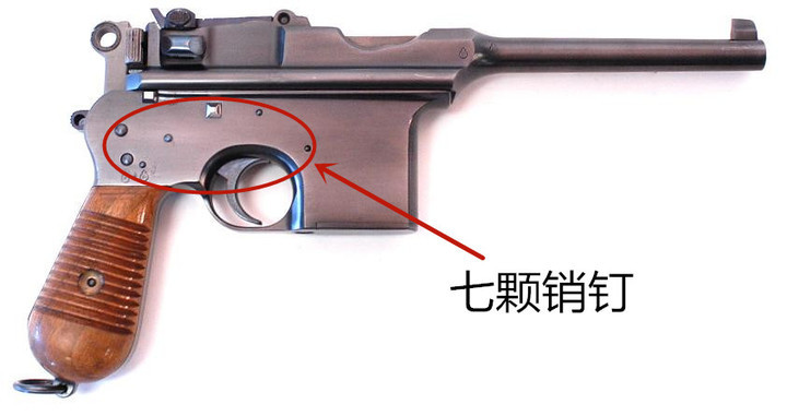二是為簡化加工,該槍大量使用銷釘結合內部機件,以至於槍身的右側尚有七顆銷釘暴露着,“七釘盒子”也就因此成為它在中國的又一個俗稱。請看圖: