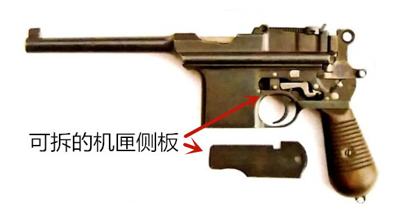 阿斯特拉900駁殼槍,其內部與毛瑟手槍並不相同。其外形,從遠處看差不多,但近看細看就有不同了。該槍最大的特徵有二,一是為便於拆卸擦拭,它的機匣左側板可以打開,“旁開門盒子炮”的俗稱就來源於此。