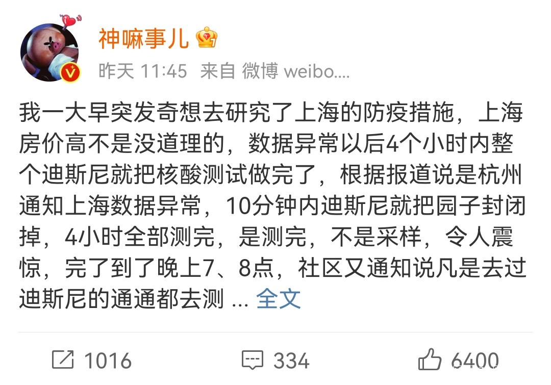 我一大早突發奇想去研究了上海的防疫措施,上海房價高不是沒道理的,數據異常以後4個小時內整個迪斯尼就把核酸測試做完了,根據報道説是杭州通知上海數據異常,10分鐘內迪斯尼就把園子封閉掉,4小時全部測完,是測完,不是採樣,令人震驚,完了到了晚上7、8點,社區又通知説凡是去過迪斯尼的通通都去測核算,結果也是一下子呼啦啦所有人就出來去排隊了,並且根據報道,因為晚上7、8點測核酸完了肯定會比較晚有人回家沒地鐵,上海市政府還專門把車子大巴也準備好了,這是有預案的。