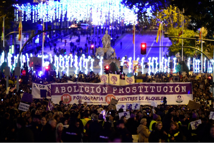 2019年11月25日,在馬德里舉行的“消除對婦女暴力國際日”紀念活動中,婦女們舉着寫有“廢除賣淫”字樣的巨大橫幅。